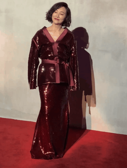 这一次她选择了一套暗红色亮片套装,阔领设计突出了惠英红优越的肩颈线条。