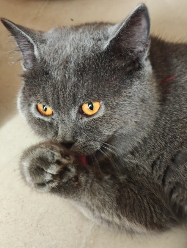 它呢?蹲在那儿,一脸淡定(其实仔细看,小得意藏不住),不停地舔着嘴唇。