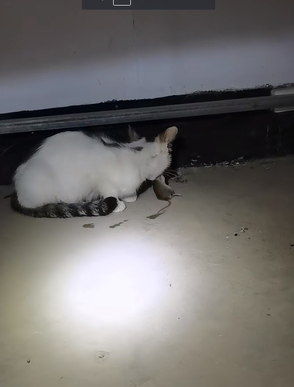不是小老鼠,是只贼大的老鼠!直接给咬死了!叼在嘴里!一路小跑着冲回家!